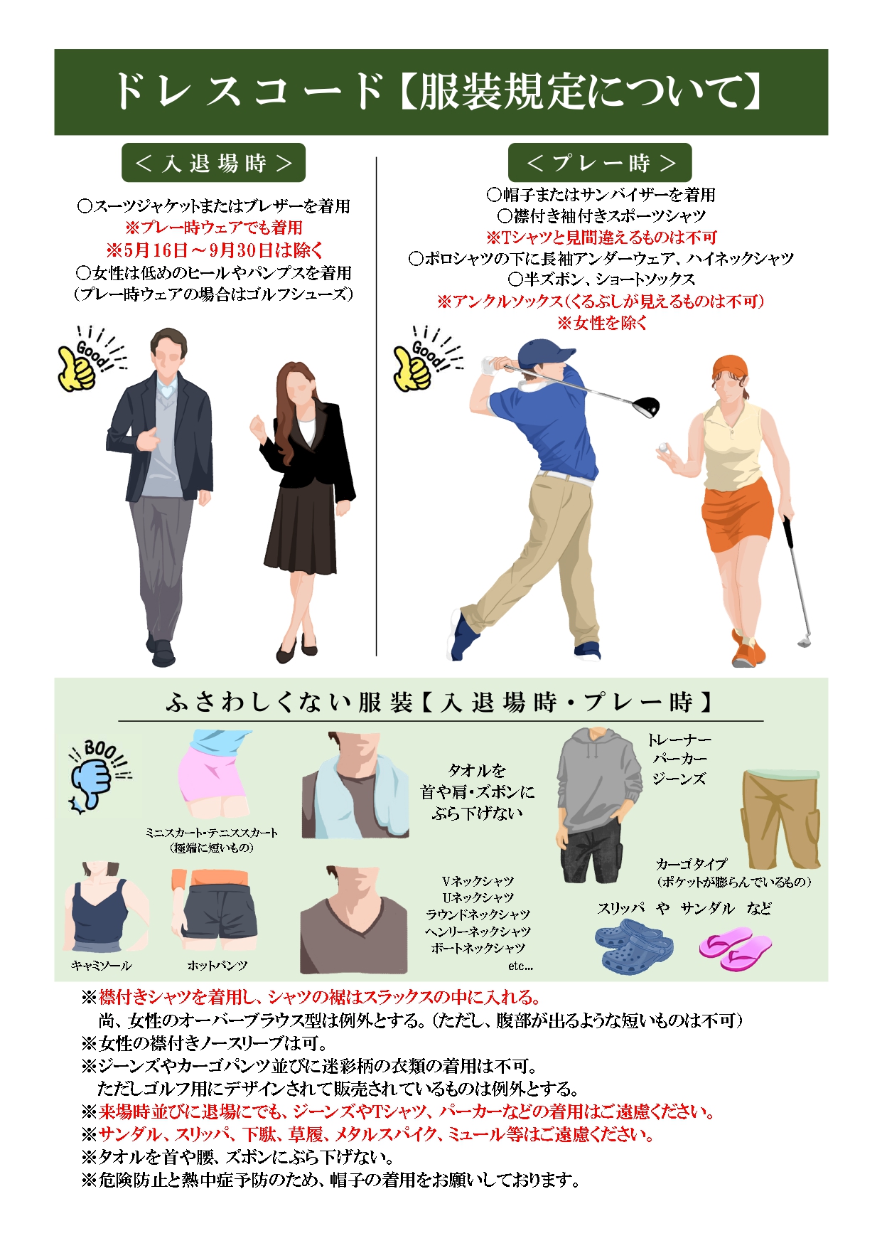 また、スリッパ・サンダルでのご来場は厳禁です。 - プレー時は帽子またはサンバイザーの着用をお願いします。